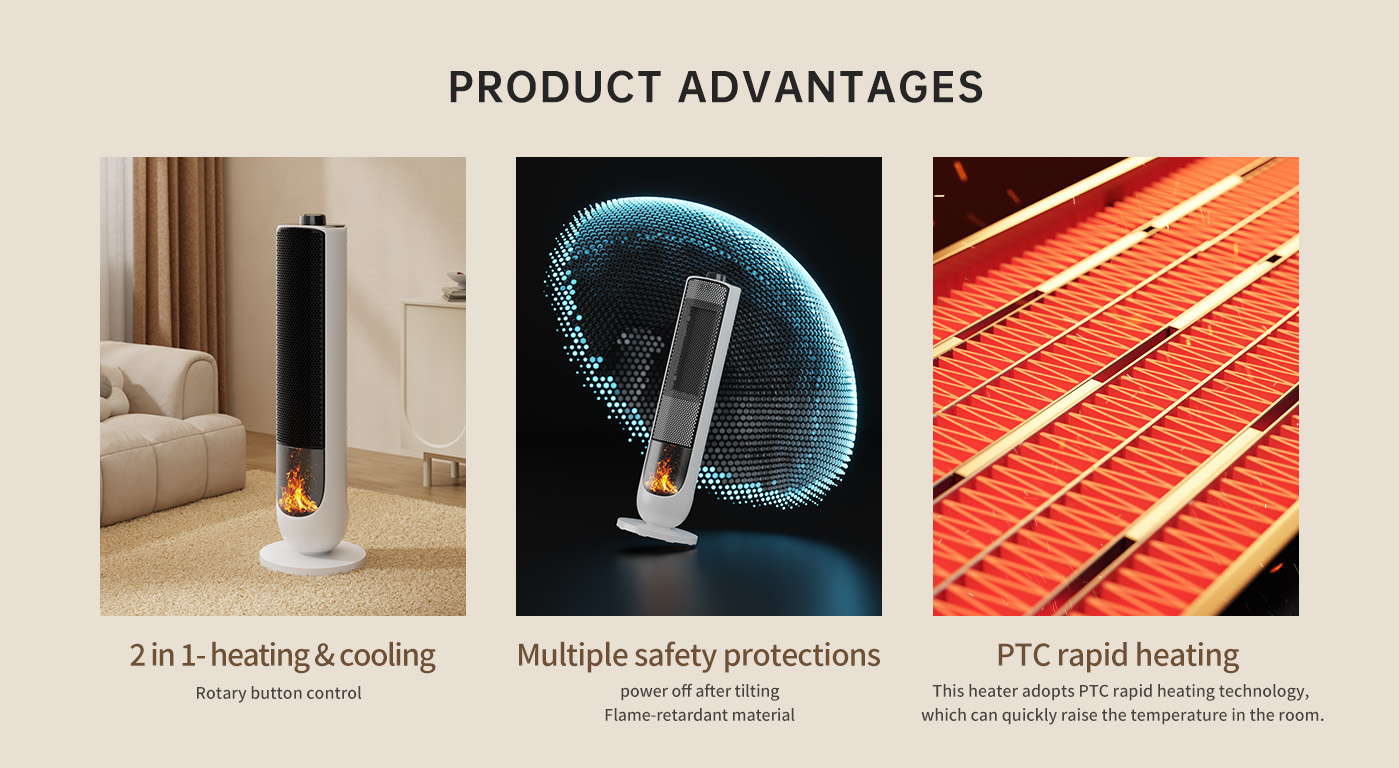 | Product features | Three-level temperature adjustment, overheat protection, intelligent constant temperature, flame-retardant materials, PTC heating, silent design.Flame decorative lamp.80° wind direction change |